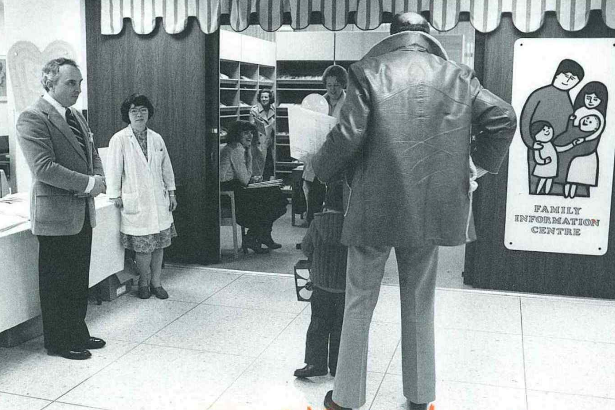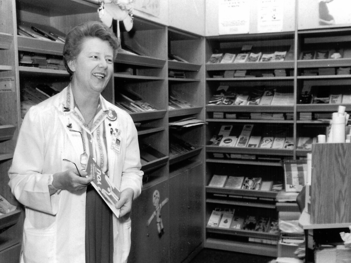 Ruth McCamus in the Family Information Centre, established in 1979 to provide medical information for families in the form of books, pamphlets and films. “The dispersion of the traditional family has created an important new role. Young parents whose own parents are thousands of miles away are turning to HSC staff for answers to questions that might otherwise remain unanswered, reported the hospital newsletter, What’s New.