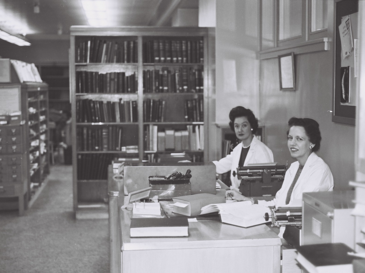 The Hospital Library’s familiar location at 555 University Avenue across from the Rotunda was not its first location in the building. The original library was located closer to the Main Auditorium, as pictured here in 1962. As the library’s offerings grew, so did the demand for space