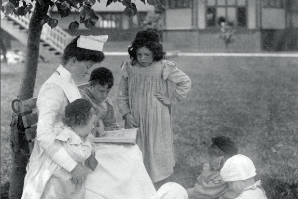 Left: Miss Elder teaching a class of children from the hospital’s wards in 1902. Right: Nurse reading to children on the lawn of the Lakeside Home for Little Children on Toronto Island, the first of two SickKids satellite facilities. Lakeside Home for Little Children was operated from 1883 to 1928.