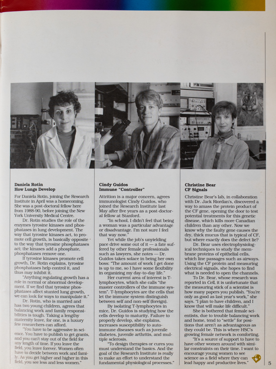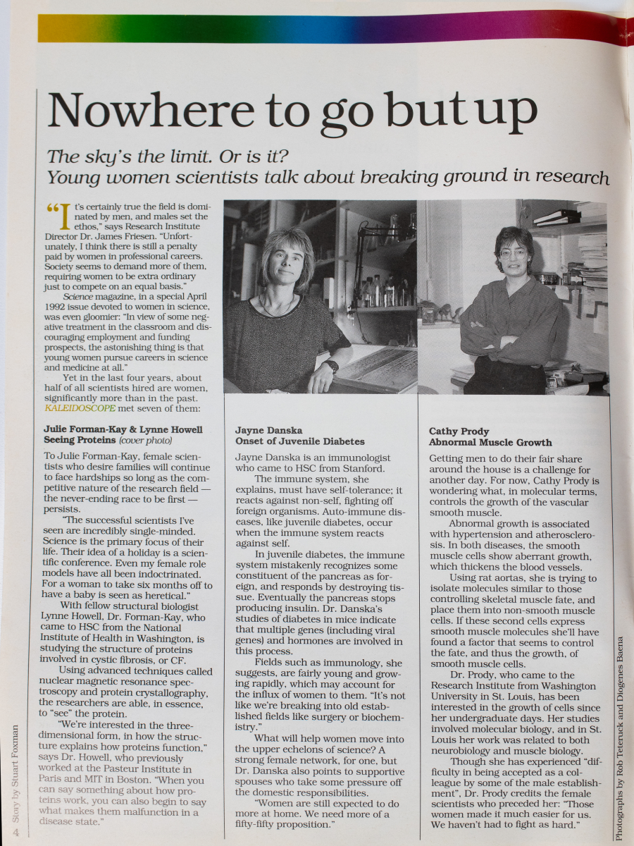 In the 1992 edition of Kaleidoscope, a magazine that used to be published by SickKids, six female SickKids scientists spoke about breaking ground in research. Drs. Julie Forman-Kay and Lynne Howell (both shown on the cover), Jayne Danska, Daniela Rotin, Cindy Guidos and Christine Bear continue to conduct their research at SickKids to this day.