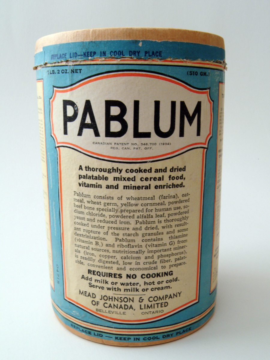 The infant cereal Pablum was first developed in the early 1930s by Drs. Alan Brown, Theodore Drake, and Frederick Tisdall*. The cereal was designed to be mixed with breast milk or formula to create an easy-to-digest and nutrient-rich food for infants.