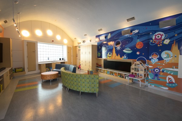 Samsung Space is a drop-in therapeutic play and recreation area offering patients, siblings and family members opportunities to spend time together, meet other families in the hospital, and play inside the space or outdoors on the patio.
